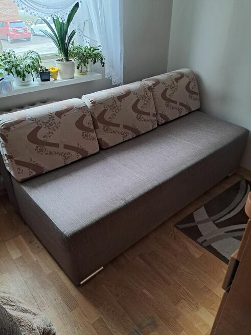 Wygodna, rozkładana sofa z pojemnikiem na pościel w szarym kolorze. Mebel w bardzo dobrym stanie, z drewnianymi ...