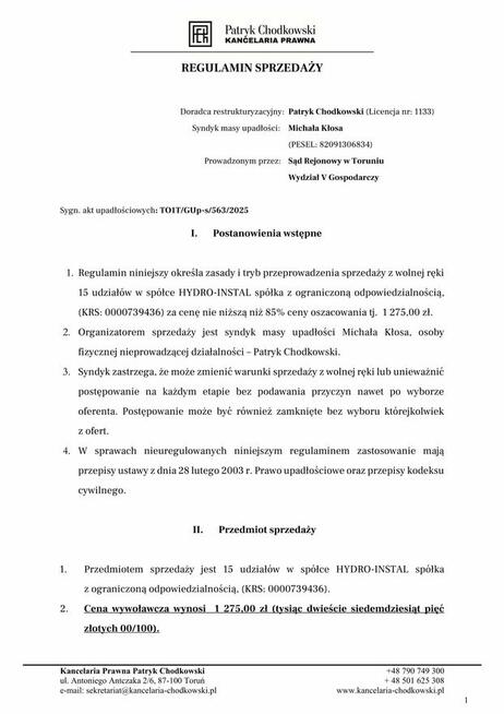 Syndyk sprzeda z wolnej ręki 15 udziałów w spółce HYDRO-INSTAL spółka z ograniczoną odpowiedzialnością, (KRS: ...