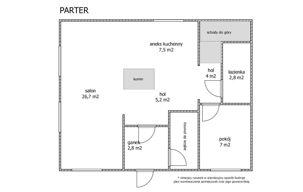 Na parterze znajduje się przestronny, jasny salon połączony z